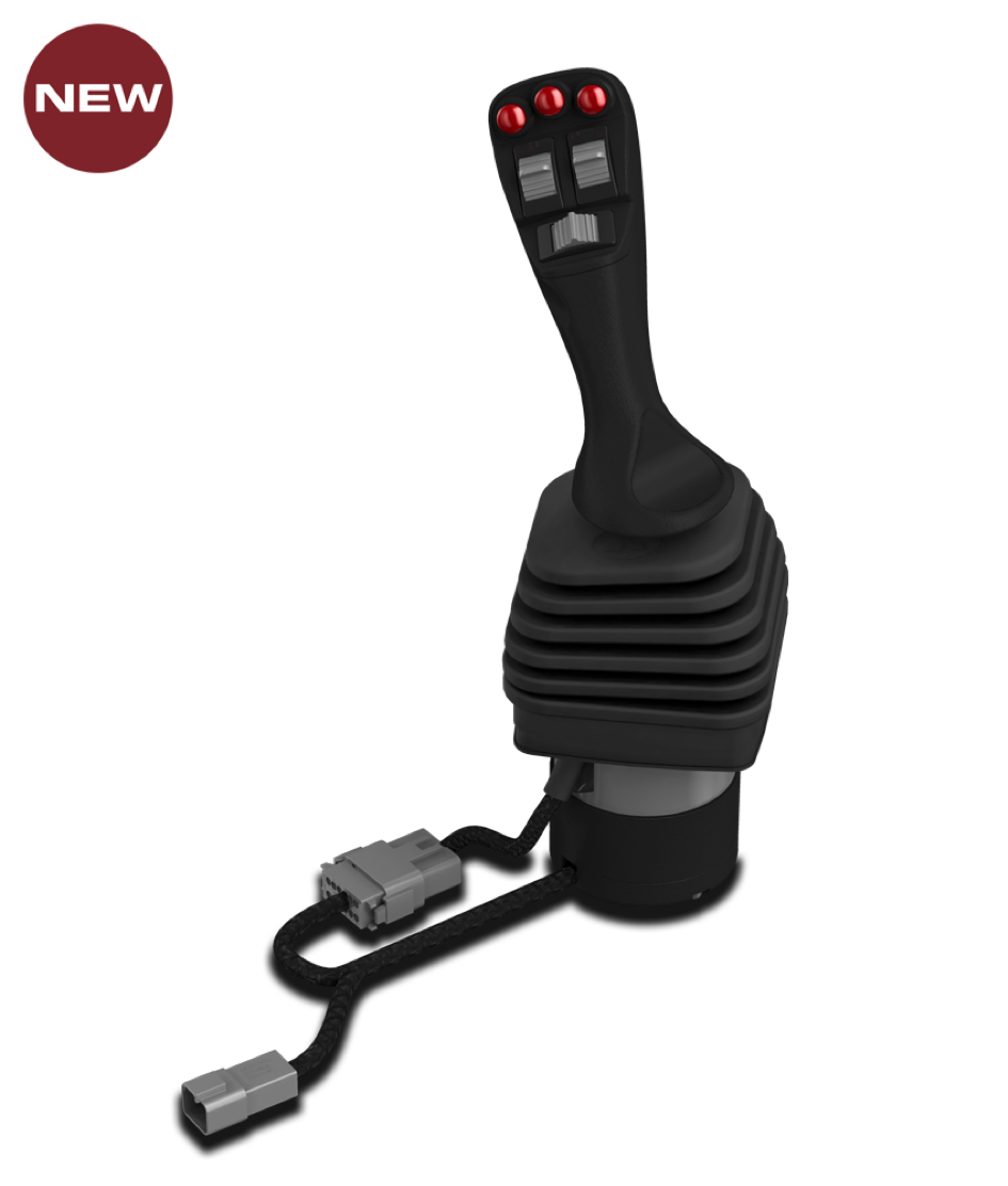 Dank seiner starken mechanischen Struktur und seines fortschrittlichen elektronischen Designs eignet sich dieser neue Joystick mit Hall-Effekt für rauhe Umgebungen und Sicherheitsanwendungen. Die mechanische und elektrische Lebensdauer des Joysticks erreicht auf jeder Achse 3 Millionen Zyklen. Mit den 4 unabhängigen Kolben und Federn ist es möglich, die Betätigungskraft und das Vorgefühl jeder Achse anzupassen. Mit den Deutsch-Anschlüssen und der mit Harz vergossenen Elektronikplatine ist die Joystick-Basis vollständig abgedichtet. Optional ist die elektromagnetische Arretierung jeder Achse erhältlich. Mit der hohen Anzahl von Eingangsstiften kann die Elektroplatine alle Signale des Griffs (Daumenräder, Drucktasten, Wippschalter usw.) erfassen und mit dem SAE J1939-, CanOpen-, CanOpen Safety- oder ISOBUS-Protokoll über das CANbus-Netzwerk senden.