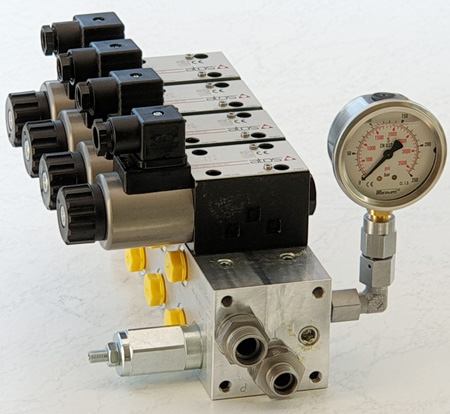 Wir liefern Reihenblöcke von 1 bis 8 Kreisläufe mit einem Druckreduzierventil in P und digitalen 4/2-Wegeventilen in NG6 im Standard. Auf Wunsch bieten wir die Kaskadenblöcke mit digitalen 4/3-Wegeventilen oder Wegeventile und Druckreduzierventile mit Proportionalmagneten.